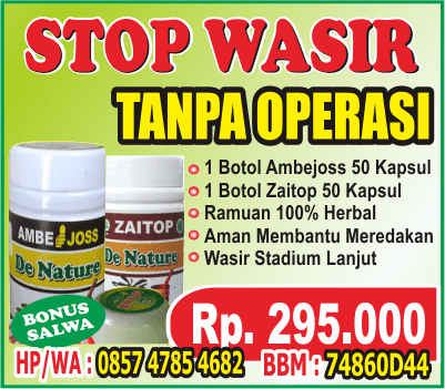Wasir Stadium III – IV : Pengalaman saudara bapak Iswanto, wasir stadium IV, dengan kondisi sudah parah, dan wasir sudah keluar sebesar kelingking, bisa di sembuhkan dalam waktu kurang lebih 1 bulan menggunakan 2 ramuan yaitu kapsul AMBEJOSS dan salep salwa. Untuk wasir luar : pengobatan yang paling baik memang harus diobati dari luar dan dalam. Untuk wasir dalam : kita menggunakan kapsul AMBEJOSS dan untuk luarnya menggunakan salep wasir salwa. Telp/SMS/WA: 0857 4785 4682 - pinBB: 74860D44
